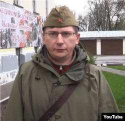 Максим Кормушкин, присвоивший памятную доску, позирует в форме красноармейца
